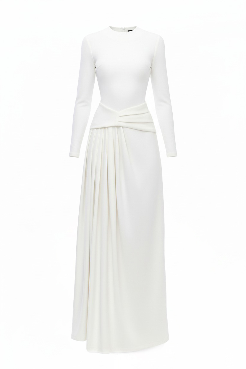 This long sleeve evening gown in pure white features a gracefully draped detail at the waist, creating a sophisticated silhouette. The neckline and fitted bodice complement the pleated skirt, adding an elegant touch to this timeless piece. Made from a soft and smooth fabric blend, the gown ensures comfort and ease of movement. Perfect for formal events, this gown exudes class and grace, making it a standout addition to any wardrobe.